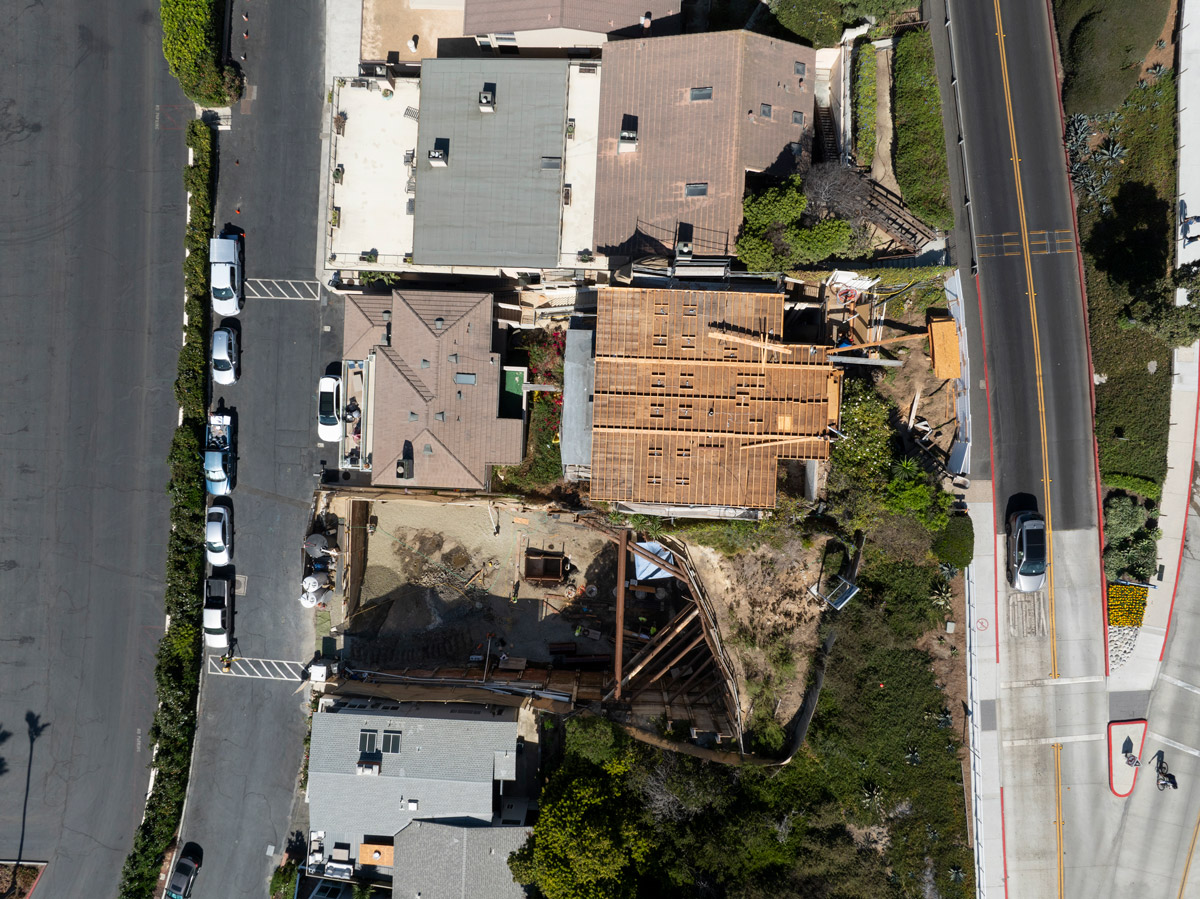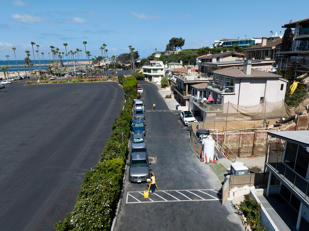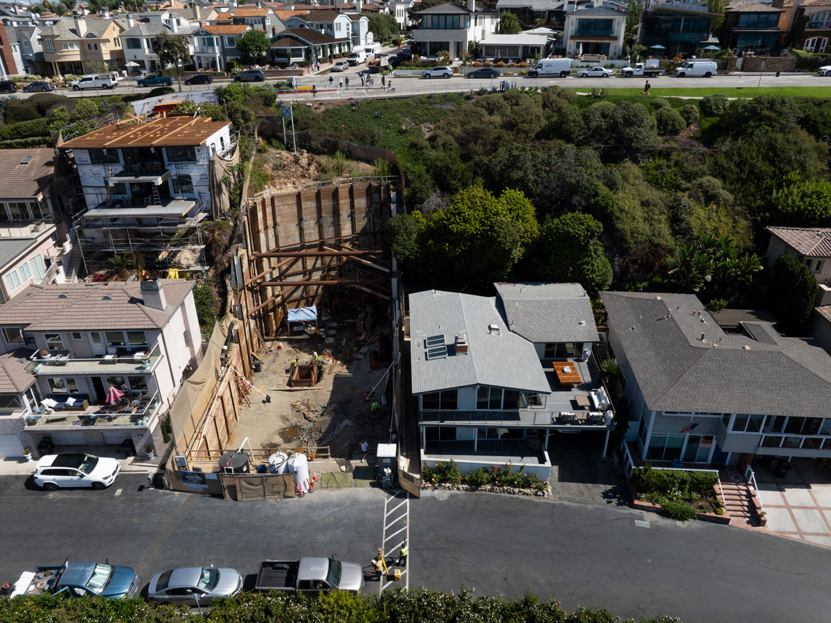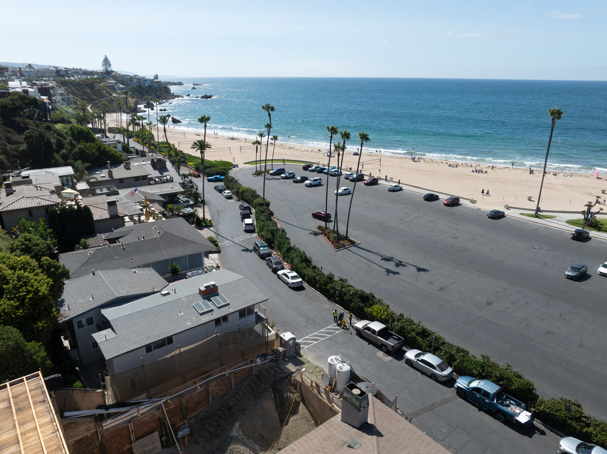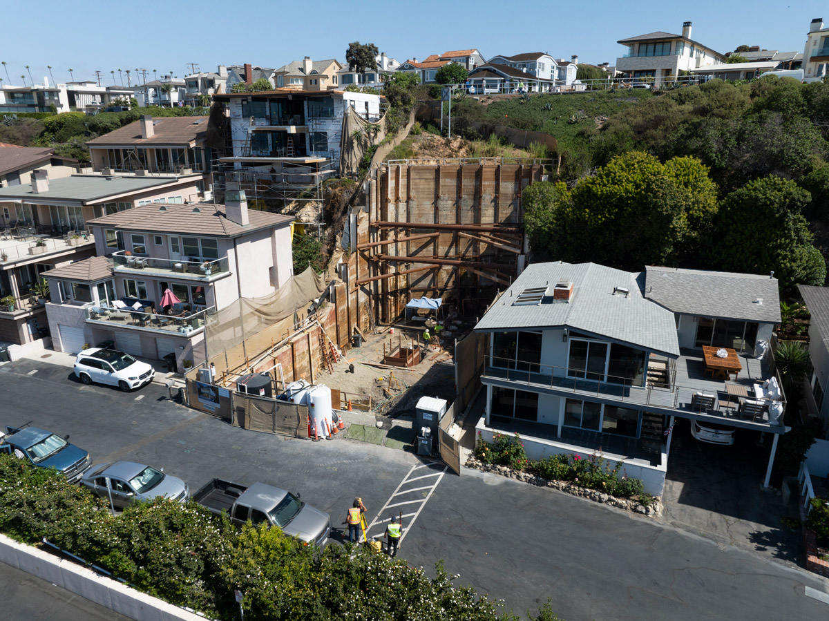 The 3100 Breakers Drive Residence is a custom residential duplex with a common subterranean garage, rooftop deck, and elevated pool, located on Breakers Drive immediately adjacent to Corona Del Mar State Beach. The project includes a 50-foot high permanent shoring wall with tiebacks. Important drainage elements include control of runoff from the ascending slope to the upper portion of Breakers Drive (which serves as beach vehicular access), a stormwater lift station, and biofiltration areas.